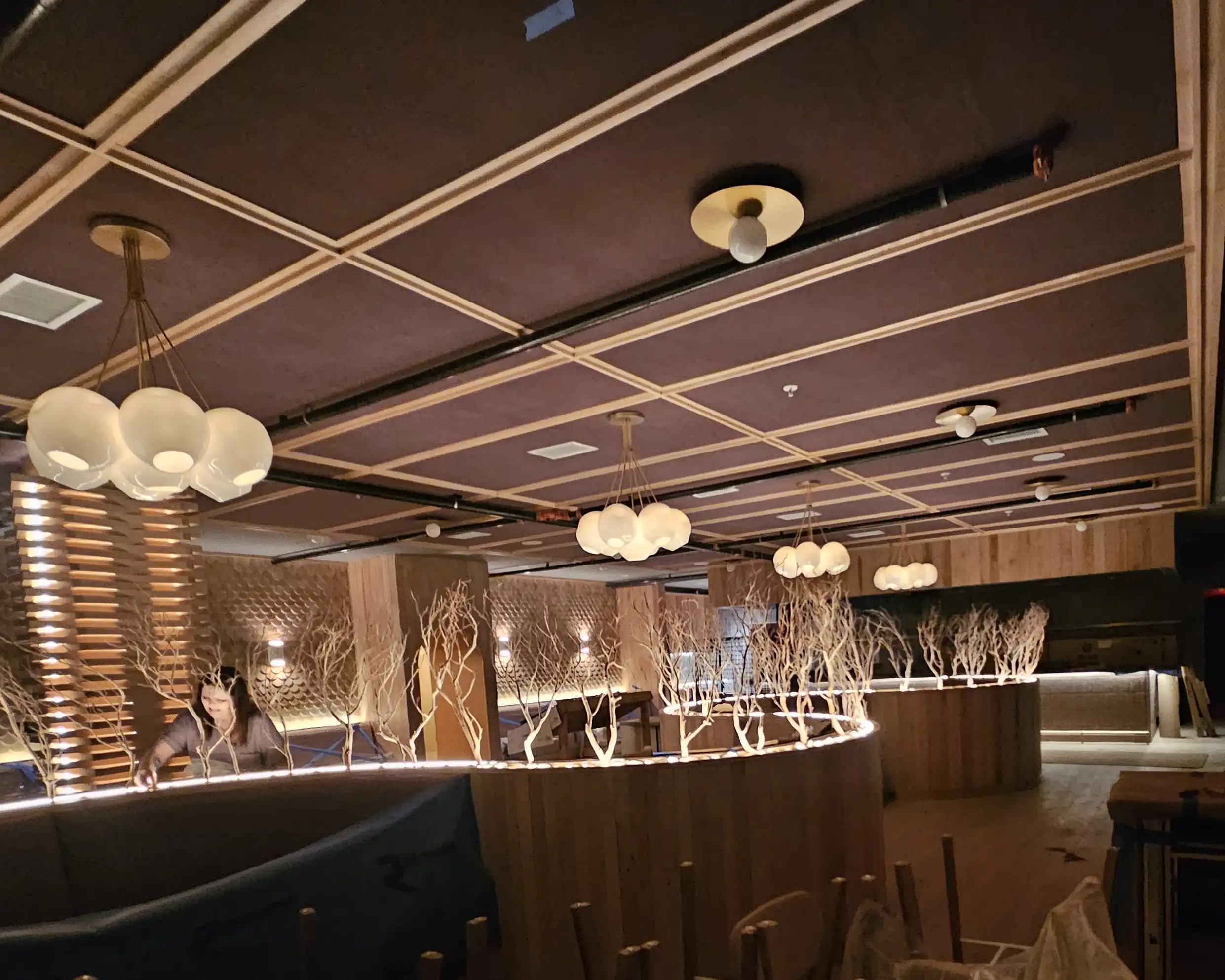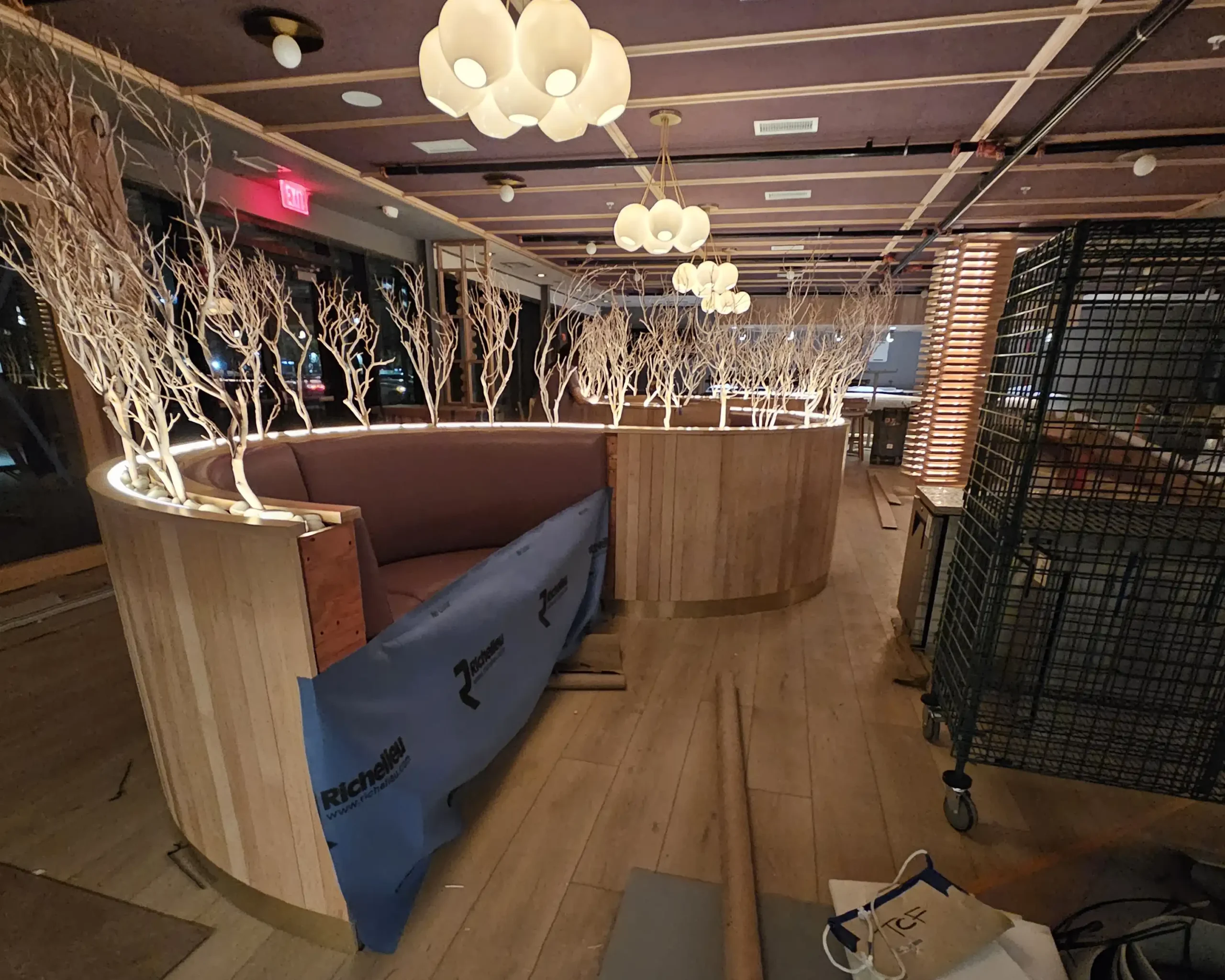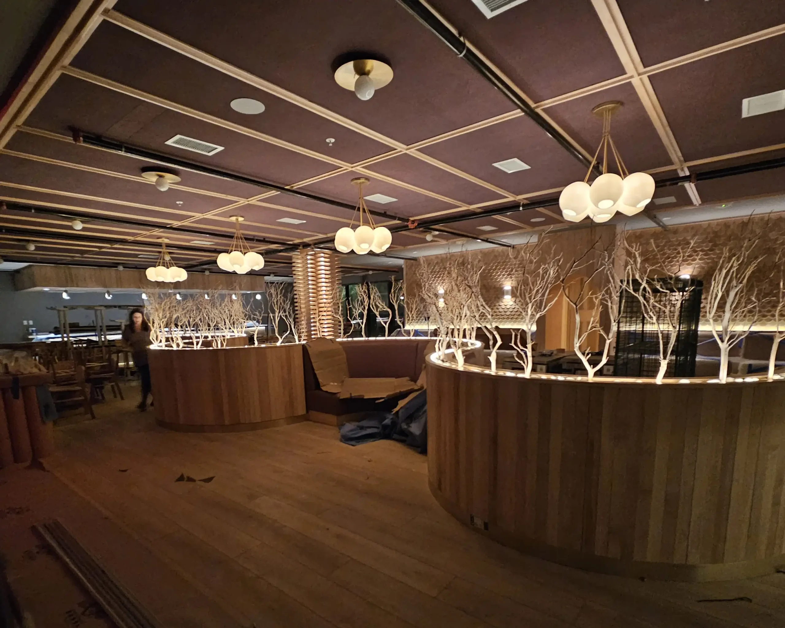 Close-up of sandblasted manzanita branches used as decorative booth dividers with soft lighting in upscale restaurant interior design